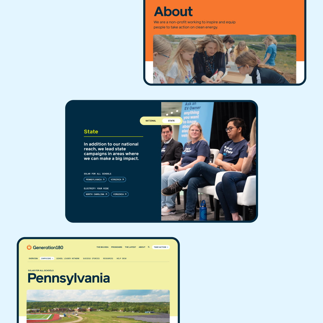 Addressing climate change isn’t limited to big corporations, wealthy philanthropists, or government entities. Everyday individuals, including us, can play a crucial role in accelerating the transition to renewable energy. Generation180 was already making strides with their national and regional campaigns, but their website didn’t showcase their impact or motivate their audience. Our objective was to create a site that mirrored their passion and made their wealth of resources accessible for all.